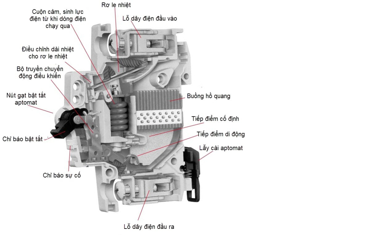 Thiết bị đóng cắt MCB có thiết kế nhỏ gọn với 5 bộ phận chính, đáp ứng yêu cầu bảo vệ mạch điện với dòng điện thấp: